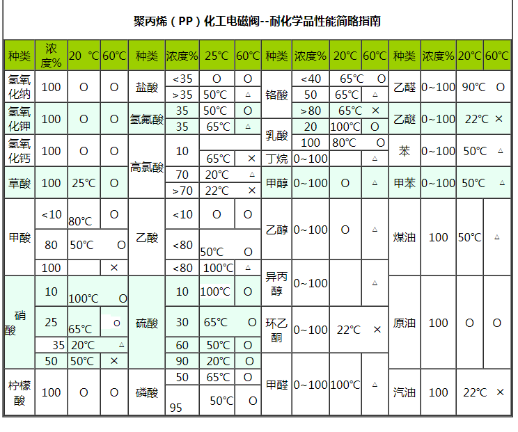 聚丙烯(PP)化工電磁閥具有優良的耐腐蝕性能,在80℃下能耐除氧化性外的一般無機酸、堿、鹽、氣體、水等的腐蝕。它對極性有機溶劑和強極性的羧酸、醇類有較大的抗溶劑能力。少數氧化性酸在濃度較高時對其有較大的腐蝕作用。有一定的剛度和強度,適用溫度為-0~120℃。