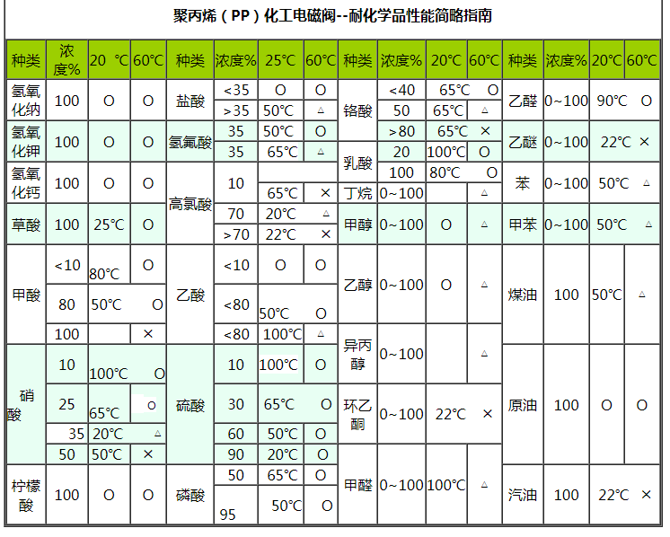 聚丙烯(PP)化工電磁閥具有優良的耐腐蝕性能,在80℃下能耐除氧化性外的一般無機酸、堿、鹽、氣體、水等的腐蝕。它對極性有機溶劑和強極性的羧酸、醇類有較大的抗溶劑能力。少數氧化性酸在濃度較高時對其有較大的腐蝕作用。有一定的剛度和強度,適用溫度為-0~120℃。