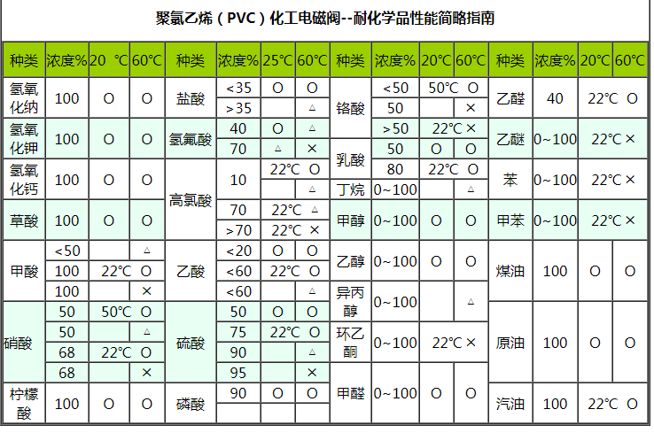 聚氯乙烯(PVC)化工電磁閥具有優良的耐腐蝕性能,耐酸(包括稀硝酸)、堿、鹽、氣體、水等的腐蝕。對無極性的烷烴及強極性的羧酸、醇類有較大的抗溶劑能力。少數氧化性酸在濃度較高時對其有較大的腐蝕作用。有一定的剛度和強度,適用溫度為-0~60℃。