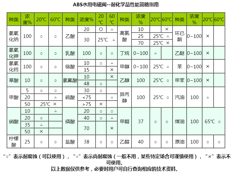 禹成牌”水用電磁閥由于啟閉原理的獨特性和結構設計的科學性,產品的所有部件均可根據不同的化學介質選用不同的高分子材料制造,同時由于它的先導孔和卸壓孔是傳統閥的幾十倍大,復位彈簧設置在介質外,因此它具有不易堵塞、耐酸堿、抗腐蝕和使用壽命長等優點,可適應于各種化學流體介質,是化工流體自動化生產設備的最佳配套產品。