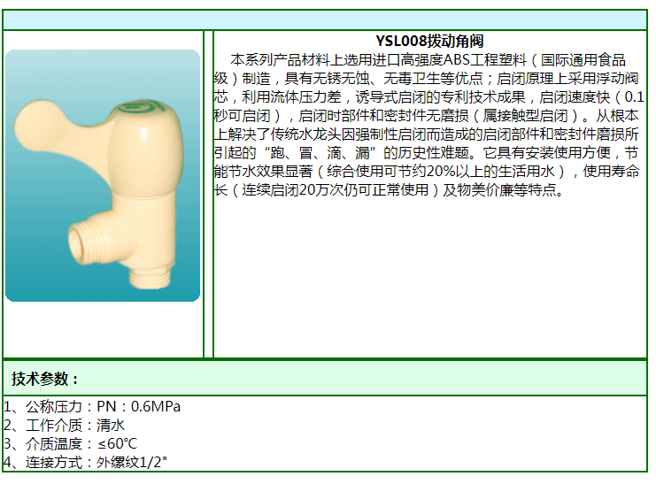 【產(chǎn)品特點(diǎn)】它具有安裝使用方便,節(jié)能節(jié)水效果顯著(綜合使用可節(jié)約20%以上的生活用水),使用壽命長(連續(xù)啟閉20萬次仍可正常使用)及物美價(jià)廉等特點(diǎn)。